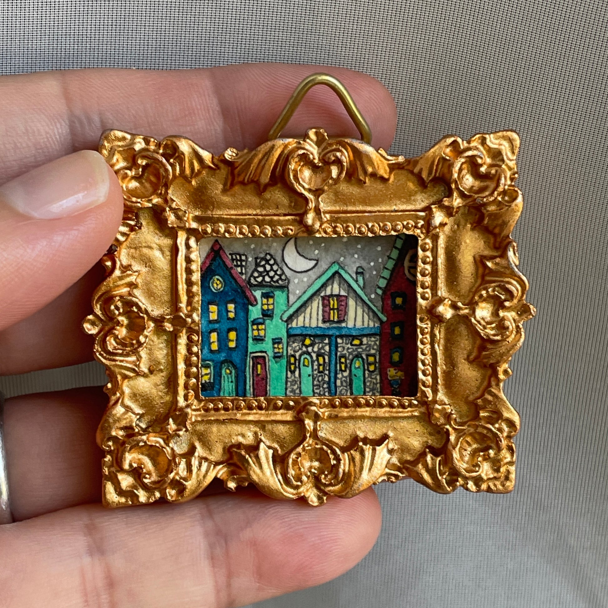 Original TEENY watercolor and pen & ink painting. This painting is in a 2.25” x 1.75" frame and the art measures 1" x .75". It is suitable for wall display. *** Please note, this piece is not protected with glass. However, it does have a wax coating to prevent damage. Please display in non-humid areas.***